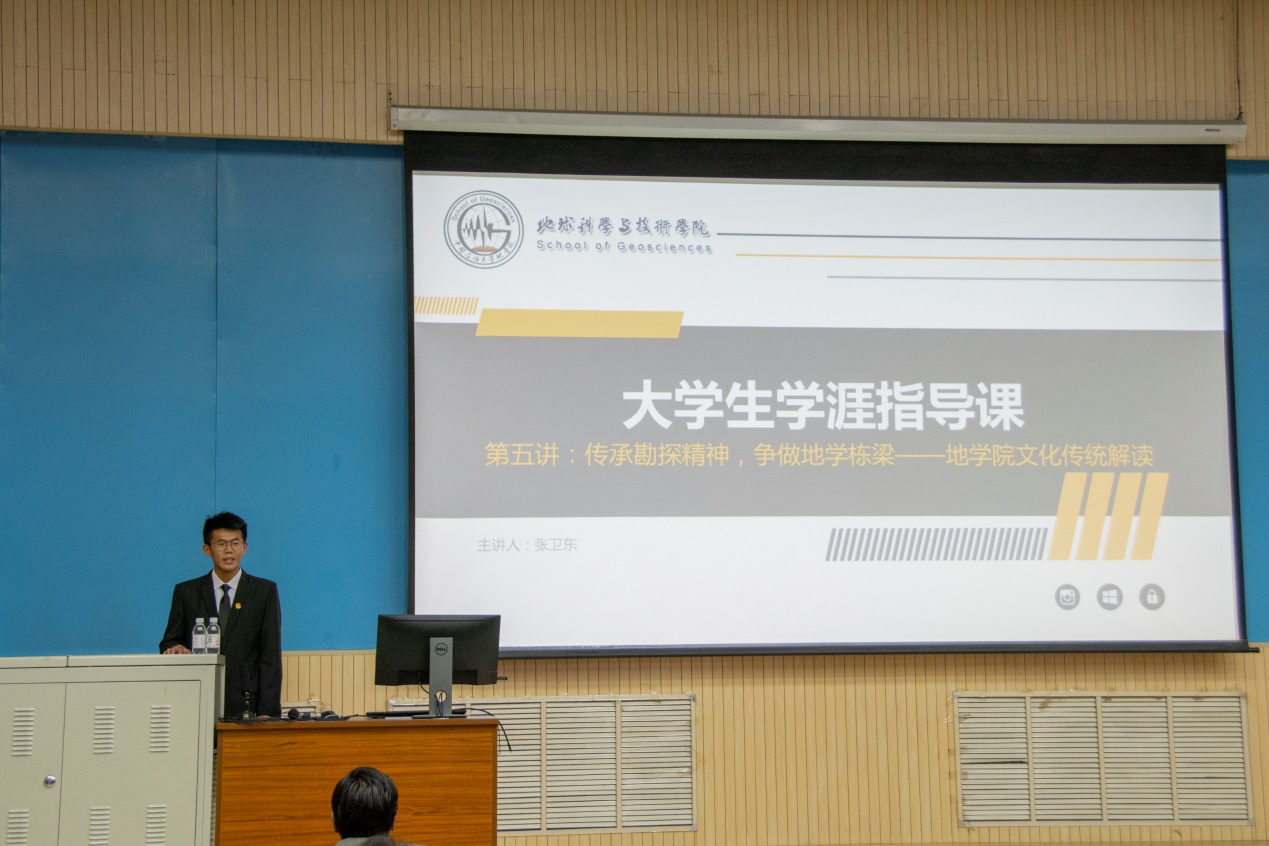 【本站讯】为引导学生树立大理想、接触大学问、形成大格局、实现大发展,5月14日,地学院《大学生学涯指导课》第五讲于南教楼100室进行,学院党委书记张卫东以“传承勘探精神,争做地学栋梁”为主题激情开讲,学院2018级辅导员张蕾、范静蕾、李文豪及2018级全体学生聆听课程,2018级学生会主席朱晓剑主持课程。