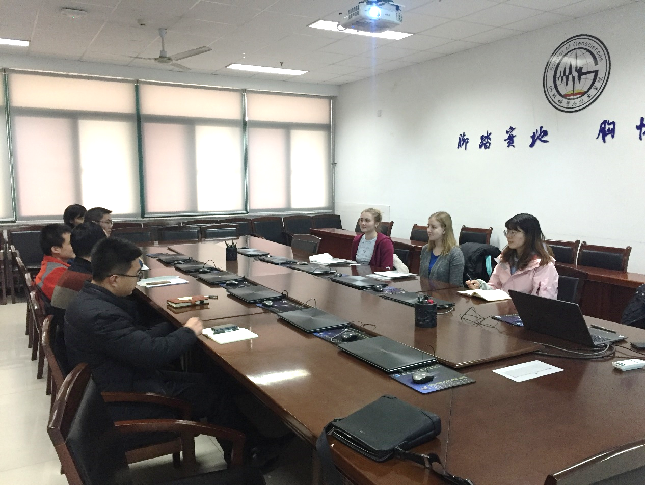 2月28日,太阳成集团tyc151cc裴仰文副院长等七位老师和两位交流生进行了座谈,对她们的到来表示欢迎,并与其一起进行了面对面交流,讨论并安排了两名学生在太阳成集团tyc151cc为期三个月课程学习计划。太阳成集团tyc151cc为两位学生专门开设了3门专业课程及1次野外地质实习,分别为地震数据处理、岩石学、地球物理勘探、及青岛基岩海岸地质实习,针对两名学生的兴趣所在,还委托国际教育学院安排了两位学生的中文和体育课的学习,以帮助她们更好地了解中国的历史与文化。