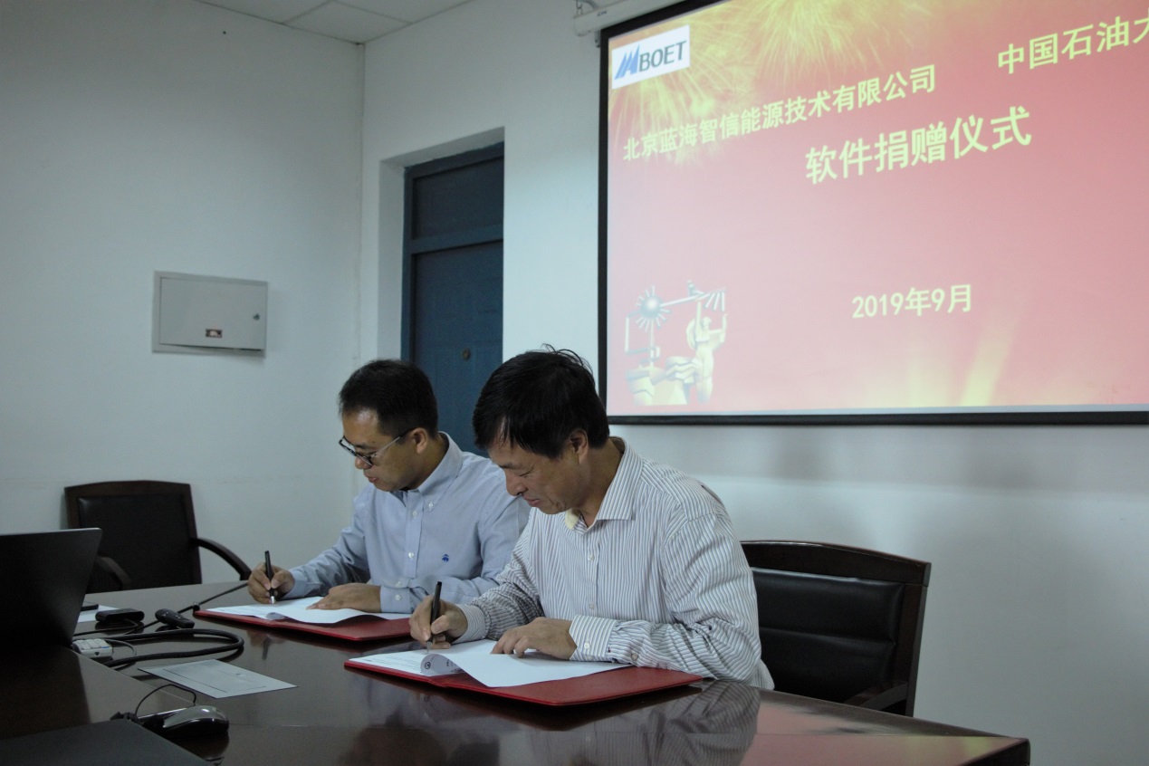 地学院院长林承焰、副总裁刘冠德签订软件捐赠协议,林承焰院长代表地学院接受捐赠。副校长姚军为刘冠德颁发捐赠证书。