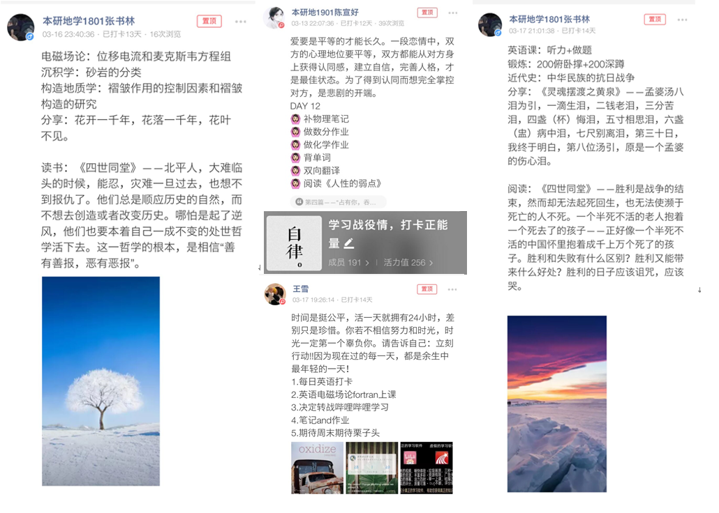 如何克服线上学习容易出现的态度懒散、效率低下等现象一直是地学院心理工作站在开展活动时思考解决的问题。心理健康工作站以学院学生的心理安全健康与学习效率为首要前提条件,积极响应病毒防治政策,推出“学习战疫情,打卡正能量”为期14天的学习打卡活动。参与者除学习状态和读书笔记的打卡外,还通过每日运动、电影观赏、佳肴制作等形式分享居家隔离的丰富生活。“尽管是在防疫这个非常时期,但是同学们还是能够在家隔离的同时坚持学习,闲暇之余还能找到各种方式放松,这不仅反映了同学们在家良好的学习状态,更是体现了同学们乐观向上和自律自强的精神!”活动发起者高艺谈道。