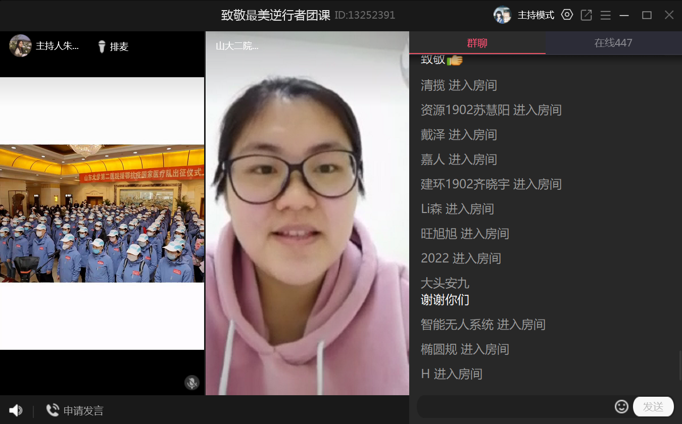 在全国上下同心战“疫”的特殊时刻,山东大学第二医院神经外科护师赵俊,挺身而出,勇于担当,成为一名“最美逆行者”,为广大团员青年树立了榜样。此次团课反响热烈,450余人在云端聆听,感受“共抗疫情、爱国力行”的朋辈力量。
