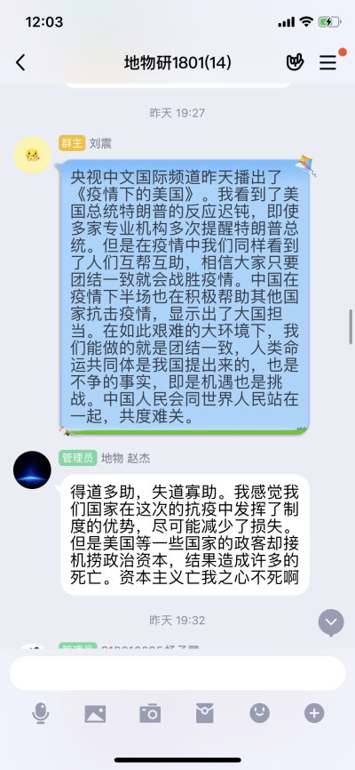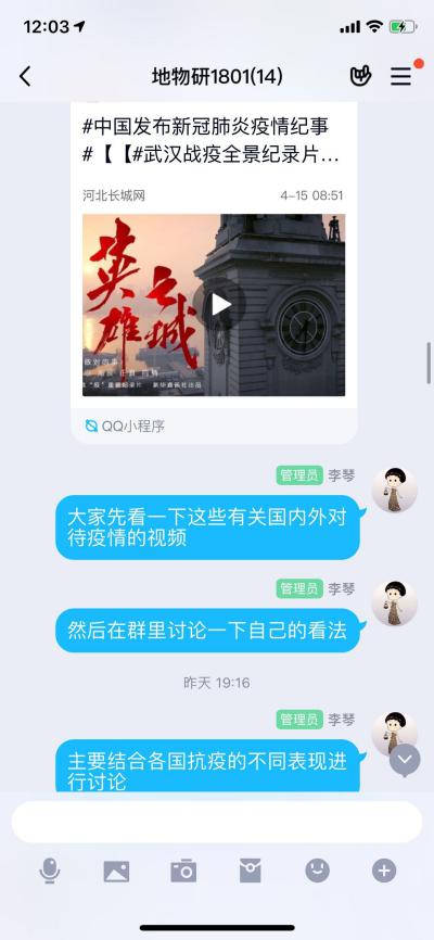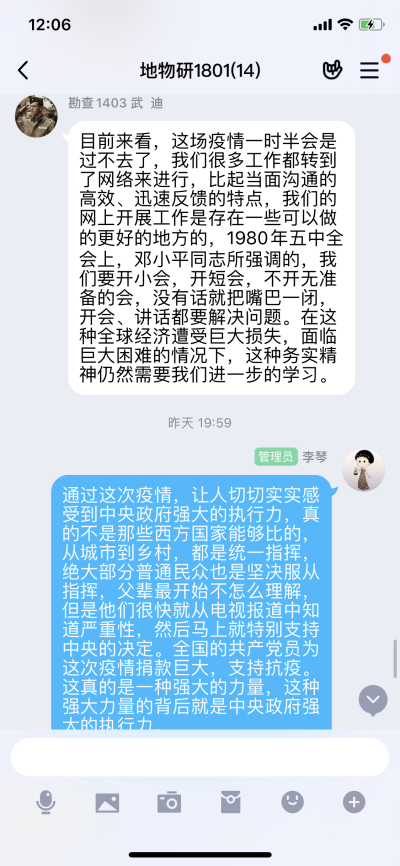 4月27日,地物研1801团支部通过线上QQ群展开一场如火如荼的线上讨论活动,支部成员针对“大国担当”、“舆论形象”等焦点问题各抒己见,最终获得坚持党中央的领导,增强打赢疫情防控阻击战的决心和勇气是取得这场战役胜利的必备条件。地物研1801团支书李琴在讨论最后总结道:“通过这次疫情,让人切切实实感受到中央政府强大的执行力。全国的共产党员为这次疫情捐款巨大,支持抗疫。这真的是一种强大的力量,这种强大力量的背后就是中央政府强大的执行力。”