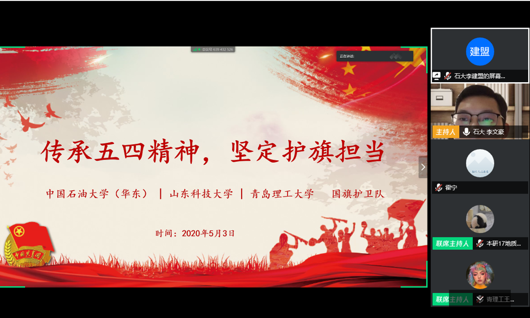 为继承和弘扬“五四”精神,号召新时代大学生国旗护卫队牢记使命、勇于担当。5月3日,中国石油大学国旗护卫队联合山东科技大学国旗护卫队、青岛理工大学国旗护卫队线上开展了“传承五四精神,坚定护旗担当”主题活动。三所学校的国旗护卫队成员们重温入团誓词,坚定护旗信念,一百六十个声音坚定而洪亮地表示了自己对于护旗的坚定信念。地学院团委书记霍宁宁强调,国旗护卫队队员们要站在五四新起点上,加强理想信念,发扬“特别能吃苦,特别能战斗”的精神,担当时代重任,面对考验,加强基础体能训练,提政治学习能力,真正展现属于青年人的奋斗风采!