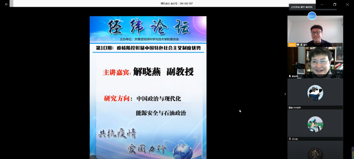 “聆听解老师的讲座让我想起邓小平曾经说过,实践是检验真理的唯一标准。一个国家的制度强不强、治理体系好不好、治理能力有没有自己独特的优势,不是靠自己说的,也不是单纯通过理论阐释就能完全令人折服的,最终都是要通过实践来检验来证明的。”地质学专业2018级本科生连泉程在“云端”聆听解晓燕教授“疫情防控彰显中国特色社会主义制度优势”的主题团课后深有感触。4月26日,地学院团委开展“云端”经纬论坛,邀请马克思主义学院副教授解晓燕为地院青年学生做主题为“疫情防控彰显中国特色社会主义制度优势”的讲座。解晓燕以生动的语言和饱满的热情向全体听众展现了她对疫情的思考以及对中国特色社会主义制度优势的深度解说,学院青年学生充分认识到有党的坚强领导,有全国一盘棋的优势,有高效的社会动员力,有坚决果断的防控举措,中国在新冠肺炎战“疫”中的表现令人民安心、令世界称赞。