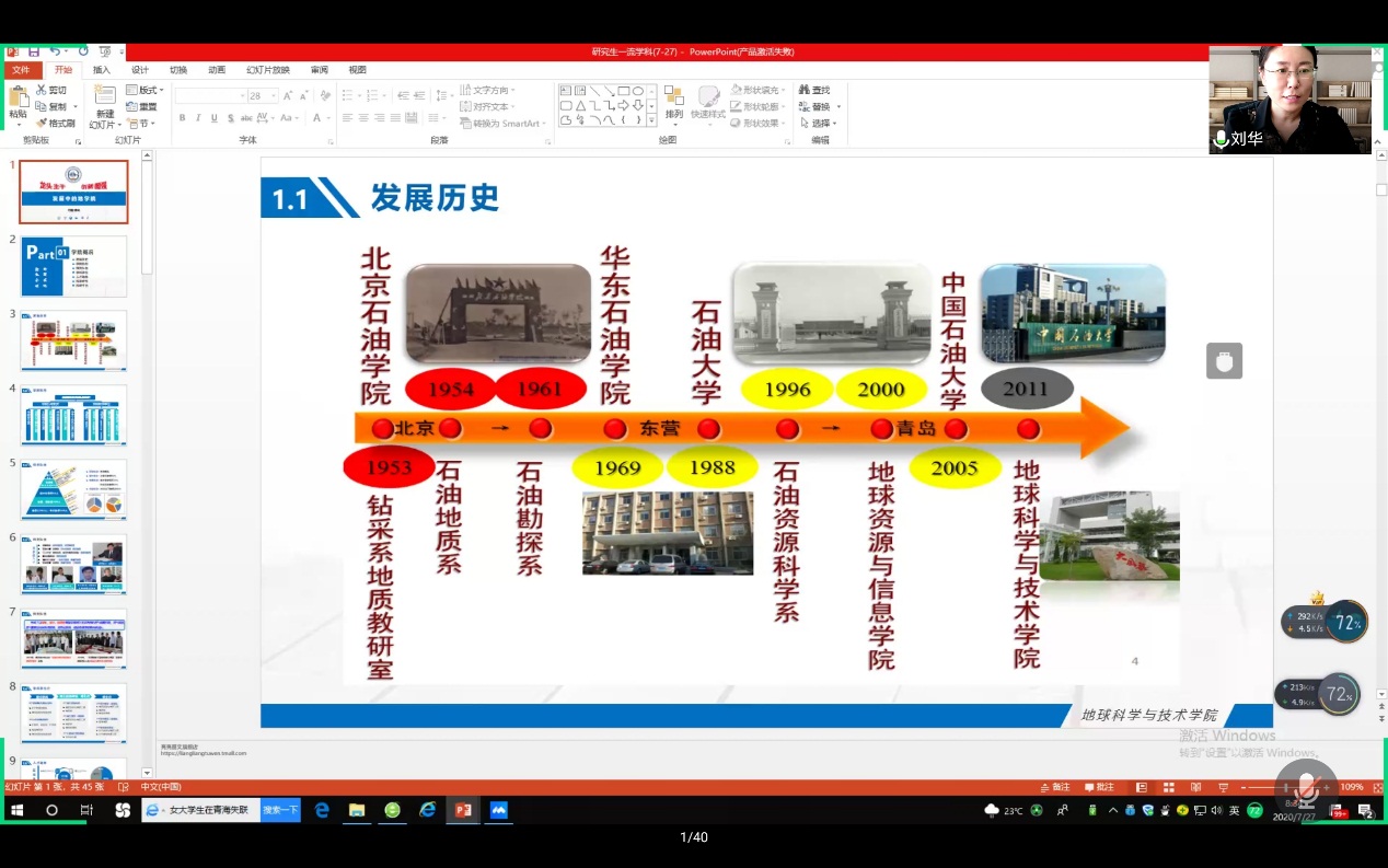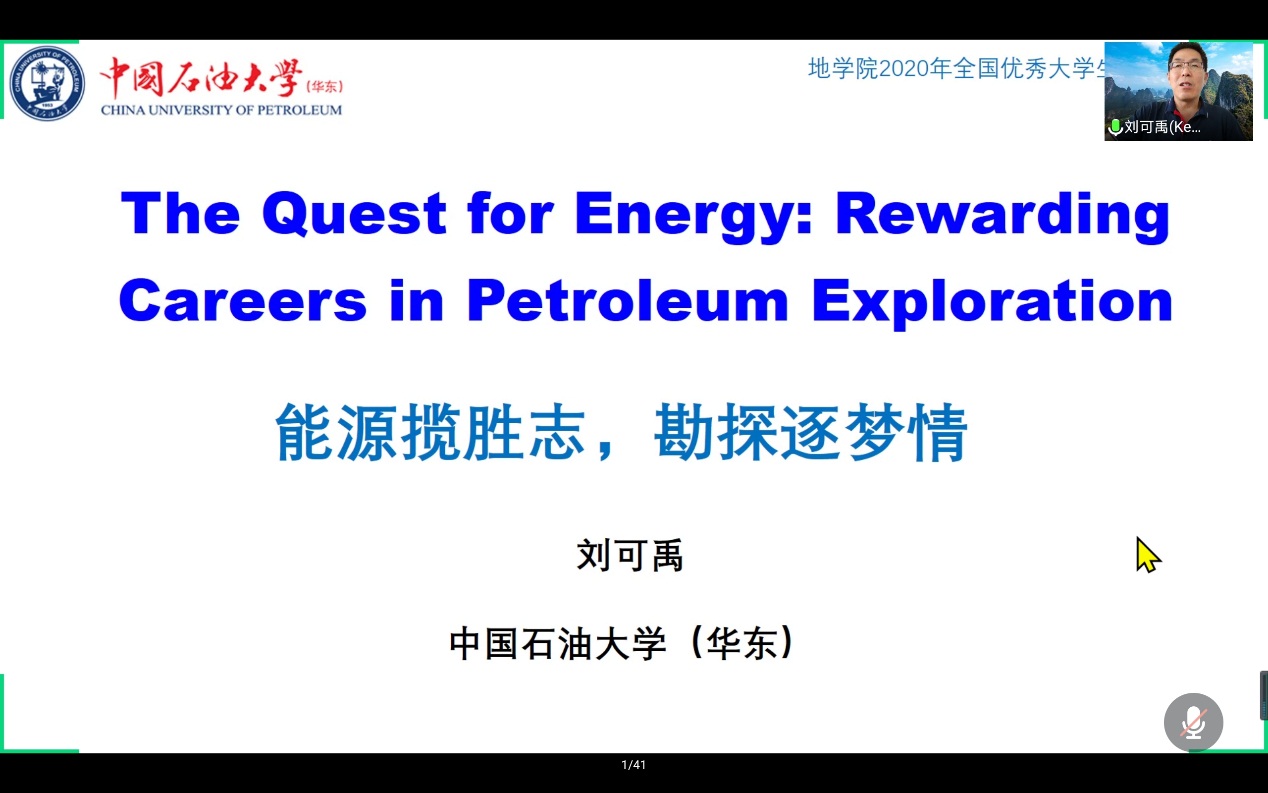 学院党委书记刘华致欢迎辞。她代表学院对参与夏令营的全体同学表示热烈欢迎。随后,刘华书记从发展历史、学院机构、师资队伍、学科学位点、人才培养五个方面对学院的概况进行生动讲解,同时结合近年来学院科研团队连续攻克复杂油气地质勘探难题的成果实例,展示学院的雄厚实力。“地学院作为双一流学科所在的学院,一直为国家能源行业输送大量人才,全国各大油田都能看到地院学子的身影。”刘华书记讲道“未来几天各位营员将和学院优秀的教师通过“云端”面对面交流,希望同学们在此次夏令营中发挥出色,崭露头角,脱颖而出。”