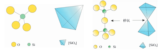 [SiO4]四面体[所有的氧离子为活性氧(端氧)](左图),[Si2O7]双四面体[四面体相互联结处为惰性氧(桥氧)](右图)