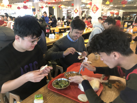2名“小学徒”和1位“大师傅”围坐在一起,包饺子、谈收获、话成长、送祝福,2020年12月30日下午,荟萃苑餐厅三楼气氛热烈,资源系师生欢聚一堂、共迎新年。