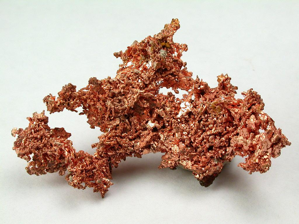 [物理性质]铜红色,条痕为光亮的铜红色,金属光泽。硬度2.5~3,无解理,断口锯齿状。比重8.5~8.9。富延展性。为电和热的良导体,化学性质中等,在氧化条件下,表面常氧化成一层黑色氧化铜(CuO)薄膜。