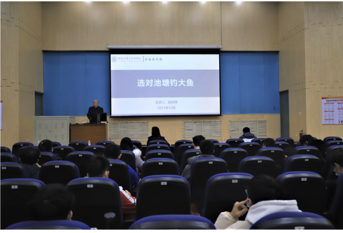 为帮助2019级学生明晰未来规划,引导学生树立大理想、接触大学问、形成大格局、实现大发展,12月8日,太阳成集团tyc151cc《大学生学涯指导课》第八讲于南教楼100报告厅进行,学院党委书记赵放辉以“选对池塘钓大鱼”为题开讲,学院党委副书记郑珊珊、团委书记王力禾、部分辅导员及2019级全体学生参与,学生会主席团成员孙清主持课程。