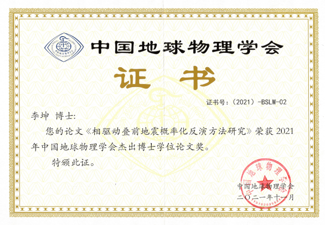 许松博士和李坤博士中国地球物理学会杰出博士学位论文奖获奖证书