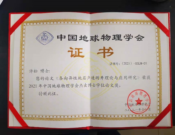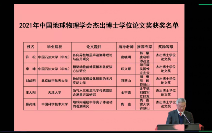 12月15日,2021年中国地球物理学会颁奖典礼在线举行,我院地质资源与地质工程专业许松博士和李坤博士的学位论文分别荣获2021年中国地球物理学会杰出博士学位论文。
