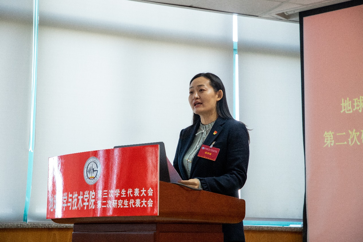 郑珊珊代表学院党委对大会的召开表示祝贺,对学生会、研究生会在在服务学生成长和学院改革发展中做出的贡献给予肯定,向学生会、研究生会的全体学生干部和广大青年学生提出三点希望:一是改进工作作风,服务同学成长;二是认真履职尽责,关注同学诉求;三是增强主人翁意识,助力学院发展。她强调,学生会和研究生会要在党的领导、团的指导下团结全院学生继承和发扬勘探精神,锐意进取、开拓创新,用青春、智慧和力量书写更加绚丽多彩的青春乐章。