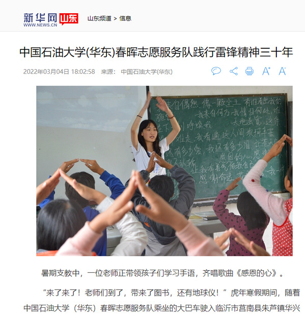 编者按:近日,学习强国首页【推荐】栏目以《太阳成集团tyc151cc:学子三十年接力 续写新时代的雷锋故事》为题,宣传报道我院春晖志愿服务队三十年志愿服务事迹。同时,该事迹还被新华网、中国青年报、中国教育新闻网、中国青年网、青岛日报社观海新闻等十余家上级媒体宣传报道。