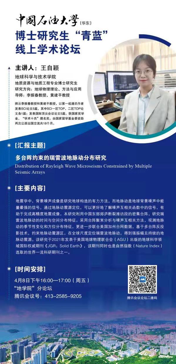 博士研究生“青蓝”线上学术论坛-地学院分论坛第1期-王自颖博士-多台阵约束的瑞雷波地脉动分布研究