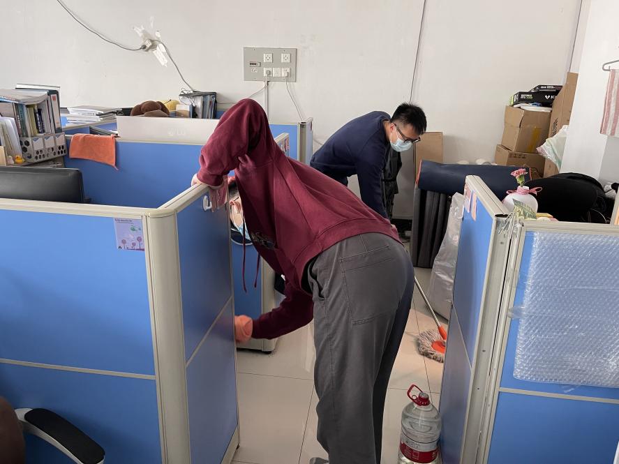 学生党员带头对办公室进行消菌杀毒