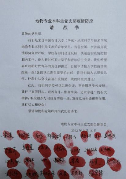 资源专业本科生党支部、储层地球物理实验室党支部、储层地球物理实验室博士生党支部、地物专业本科生党支部等支部纷纷签署《疫情防控请战书》,发出了“我是党员我带头”,“我是党员我先上”的最强音,为后续志愿服务工作开展打好了坚实的基础。