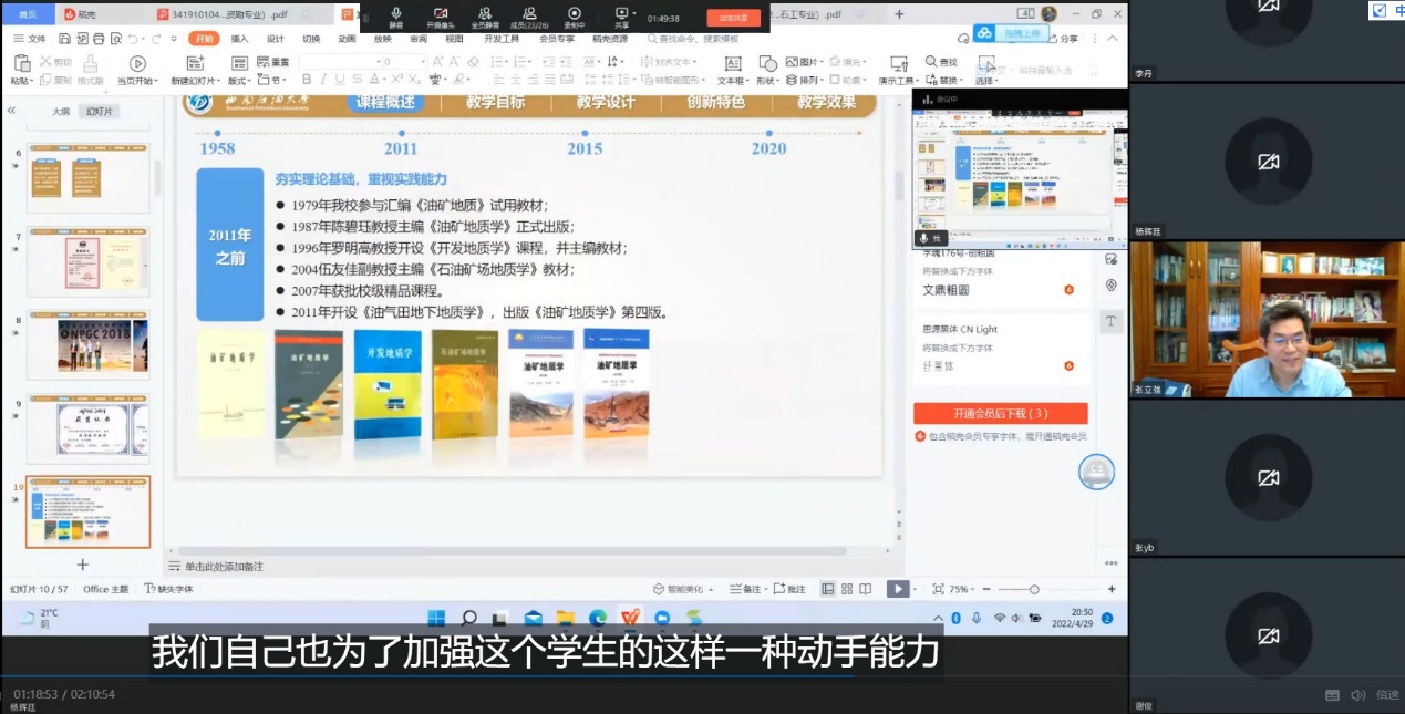 东北石油大学孙雨教授介绍了该校油田开发地质学60余年的开设历史,开展了线上线上混合式教学,尤其是在实践教学、案例教学方面特色鲜明。在原来课程设计的基础上,增加了岩心观察描述、水驱剩余油分析等单项实训,改革了课程的综合设计;结合科研生产案例,开展开发过程中的地质及动态分析等教学环节,提升学生分析问题和解决问题的能力。
