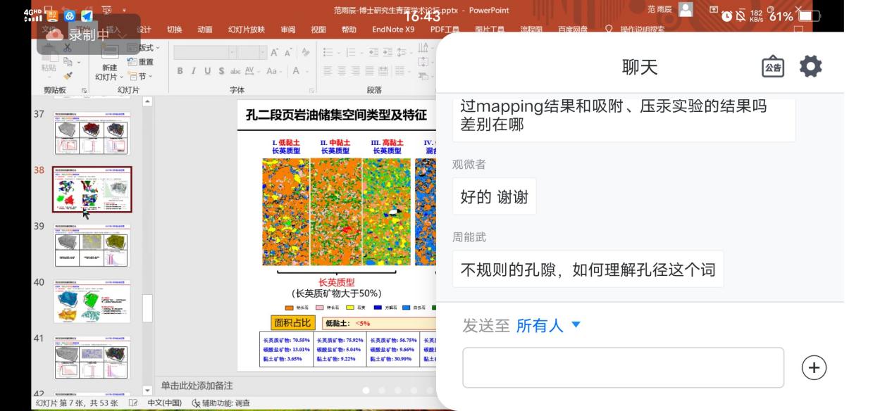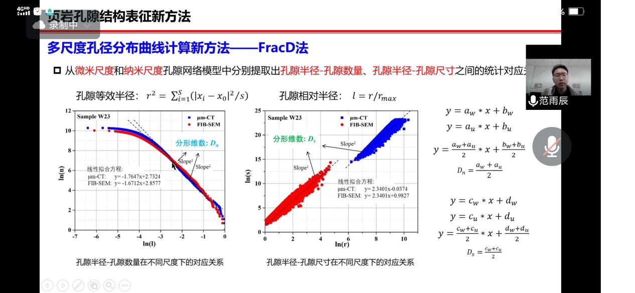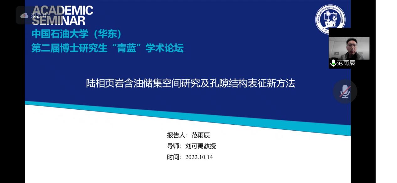 本期论坛邀请范雨辰博士做了“陆相页岩含油储集空间研究及孔隙结构表征新方法”的学术报告,报告以40分钟左右的时间分别介绍了沧东凹陷孔二段陆相页岩含油储集空间类型划分和三种页岩孔隙结构表征的新方法:适用于强非均质性陆相页岩孔隙三维空间表征的大体积FIB-SEM三维重构(LV-FIB-SEM)、适用于海相龙马溪组页岩团簇式分布孔隙的连通性评价参数以及基于分形维数的多尺度孔径分布曲线计算方法FracD法。学术报告后,范雨辰博士认真解答了线上师生的问题,参与交流的师生发言踊跃。本次报告的成功举办为标志着学校第二届博士研究生“青蓝”线上学术论坛正式开幕,本届论坛为期3个月,地学分论坛将每周举办1期,届时将邀请11位博士做学术报告。期望本届博士论坛能为学院研究生营造宽松活跃的学术交流氛围并积极拓宽研究生的学术视野。