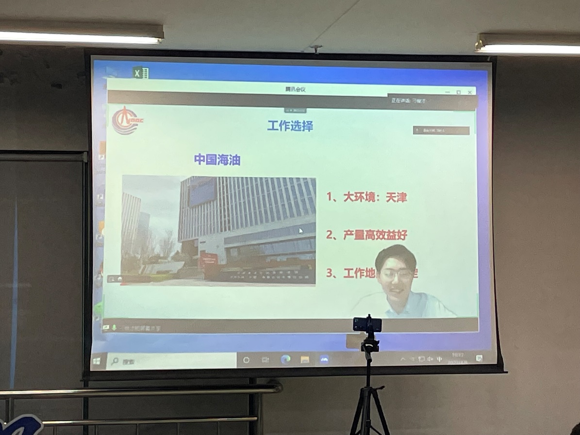 刁俊才首先结合自己的学习科研情况、个人特点和实习经历,从不同角度对私企和国企工作进行了详细对比,讲述了自己选择中海油(天津)的心路历程。他结合工作后的科研和获奖经历,鼓励同学们在工作中要积极参与,提升存在感,加速融入团队。