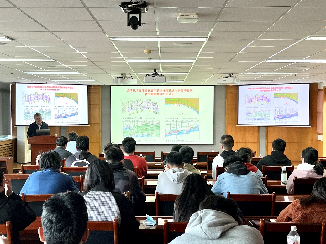 2023年4月26日下午,教育部“油气田开发地质课程组虚拟教研室”举办线上、线下学术前沿公开课——名师讲坛,邀请原中科院地质与地球物理所研究员、博士生导师罗晓容教授作题为《碎屑岩储层结构非均质性特征及油气地质意义》的学术报告,地质系主任吴孔友教授、资源系部分教师、地质资源与地质工程方向的硕士和博士研究生、以及部分资源勘查工程专业学生参加了线下学习研讨;来自全国30余所高校和企业的70余位专家学者参加了线上会议,教育部虚拟教研室主任、资源系主任张立强教授主持会议。
