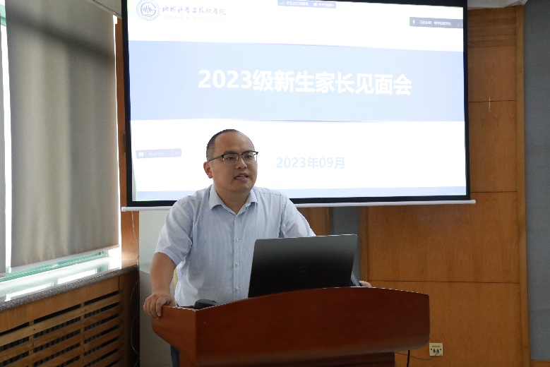 研究生辅导员栗磊介绍了学院毕业生就业情况,他通过解读国家发展战略,分析社会就业形式,通过历年学院毕业生去向等详实数据,认为无论以后是升学还是找工作,地学院学生都有得天独厚的机会和选择,增强了2023级新生及家长对未来职业发展的信心。学校心理健康中心辛晓雯以“从‘心’出发——大学新生家长的适应与成长”为题,帮助学生家长如何进行心态调整,成为孩子成长的资源,同时为家长介绍了关于心理健康的基本知识和常见误区,引导家长正确看待心理健康情况。本科生辅导员姜永昶以“良好的开端是成功的一半”为题,对大学生新生适应问题进行说明。他表示,大学是一个环境由简单变为复杂、身份由单一变为多样、生活由依赖变为独立的过程,希望新生家长能够与学校密切配合,让新生更快地适应大学生活。