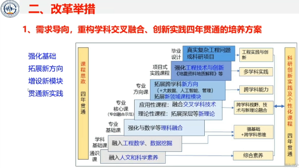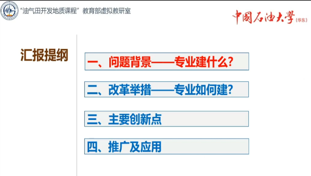 张立强教授从资源勘查工程专业建设中的 “建什么”、“如何建”、“主要创新点”、“推广及应用”四个方面介绍了资源勘查工程专业持续建设的目的、存在的问题、采取的创新措施以及取得的成果等。为了完成党和国家的要求、适应能源行业发展需求、满足新时代学生需要、达成持续升级的目标,专业建设重点开展了4大改革举措:需求导向,重构学科交叉融合、创新实践四年贯通的培养方案;育人导向,创建教学科研一体、多元主体协同的教师教学发展与育人共同体;资源导向,打造信息技术赋能,“两性一度”的专业核心课程群;工程导向,构建产科教融合、虚实结合的实践创新平台和实践体系。在专业持续建设中,率先提出并实践了多学科优质资源转化为专业教学优势的理念,创建了思政引领、教学科研一体、产科教多主体协同育人团队的建设机制,形成了直面工程、虚实结合、创新实践四年贯通的产科教融合实践平台。