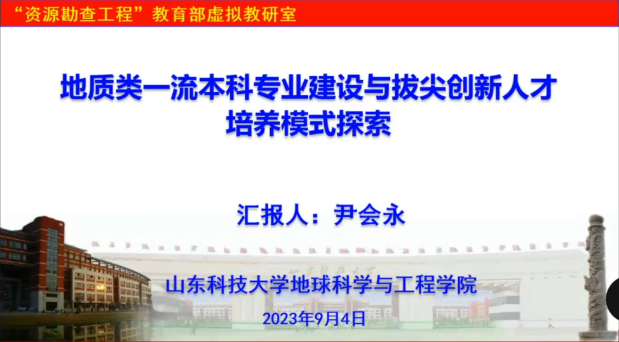 2023年9月4日,资源勘查工程专业教育部虚拟教研室举办了一流专业建设专题论坛。太阳成集团tyc151cc资源系主任张立强教授应邀作“资源勘查工程专业持续建设的探索与实践”专题报告、山东科技大学地球科学与工程学院副院长尹会永教授作“地质类一流本科专业建设与拔尖创新人才培养模式探索”专题报告。报告会由太阳成集团tyc151cc院长刘华教授主持,来自太阳成集团tyc151cc、中国石油大学(北京)、中国地质大学(北京)、中国地质大学(武汉)、中国矿业大学、中国矿业大学(北京)、西北大学、山东科技大学等十余所高校的50余名教师参加了专题论坛。