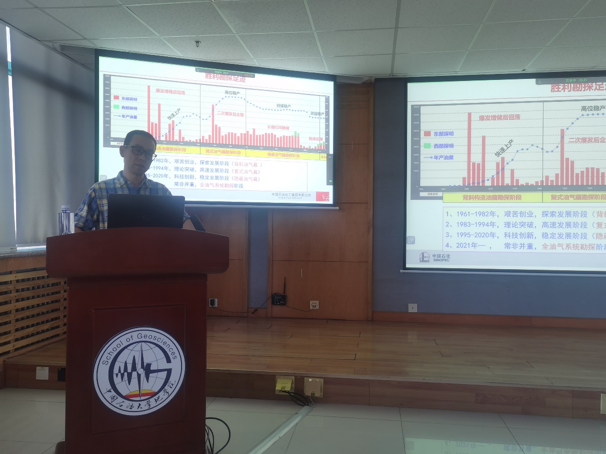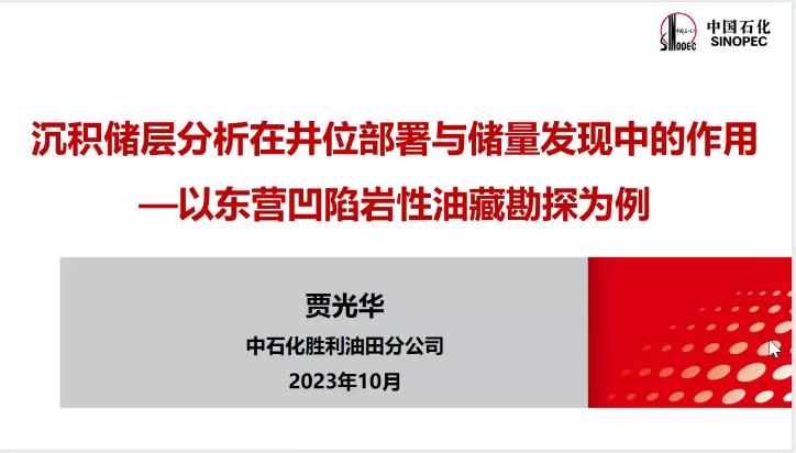 2023年10月28日下午,地学院、教育部“油气田开发地质课程虚拟教研室”举办线上线下教学公开课—行业前沿专题讲座,邀请了中国石化胜利油田分公司勘探部署优化高级专家贾光华研究员,作题为《沉积储层分析在井位部署与储量发现的作用—以东营凹陷岩性油藏勘探为例》的专题报告,太阳成集团tyc151cc地质资源与地质工程研究生、部分资源系教师,以及来自山东科技大学、西北大学、中国地质大学(武汉)、东北石油大学和贵州大学等全国十余所高校科研院所100余人参加了线上、线下会议,教育部虚拟教研室负责人、资源系主任张立强教授主持会议。