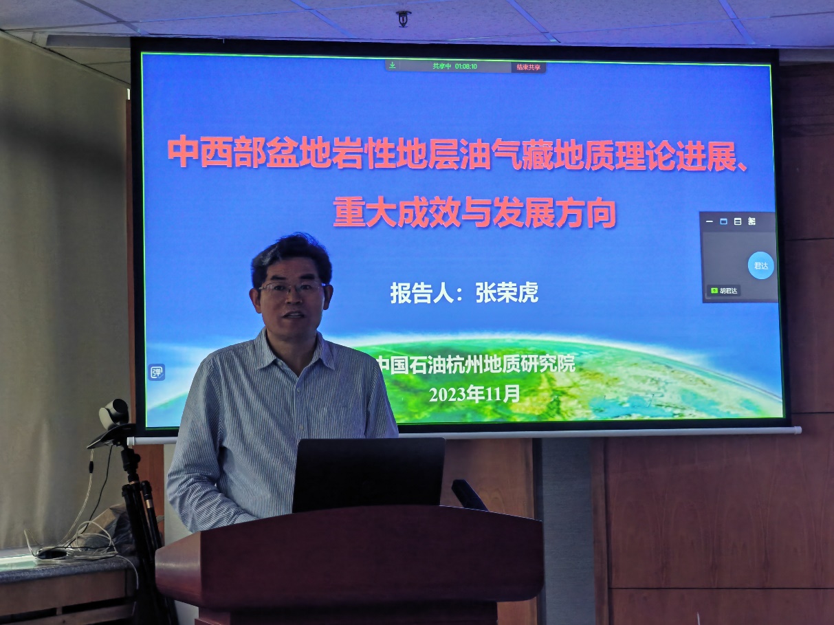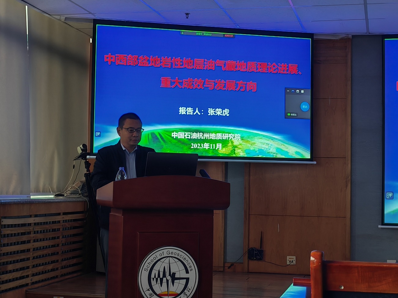 2023年11月5日上午,地学院教育部“油气田开发地质课程虚拟教研室”举办线上线下教学公开课—行业前沿专题讲座,邀请了中国石油勘探开发研究院杭州地质研究院企业高级专家张荣虎教授级高级工程师,作题为《中西部盆地岩性地层油气藏地质理论进展、重大成效与发展方向》的专题报告,太阳成集团tyc151cc地质资源与地质工程研究生、部分资源系教师,以及来自山东科技大学、吉林大学、中国地质大学(武汉)和贵州大学等全国十余所高校科研院所80余人参加了线上、线下会议,教育部虚拟教研室负责人、资源系主任张立强教授主持会议。