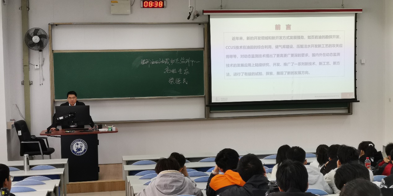 10日上午,柴德民专家还为测井系新生授课,重点介绍了油藏动态监测在油田勘探开发中的角色定位、当前的动态监测主导技术和主要装备及油藏动态监测与地球物理测井的紧密联系等,还特别介绍了动态监测技术在页岩油勘探开发、CCUS技术利用、储气库建设、压驱注水开发等新方向、新技术、新工艺等方面的应用及前景。柴德民也表达了现场对测井等专业人才的渴求,勉励同学们努力学好本领,为更好地服务油气行业打好基础。