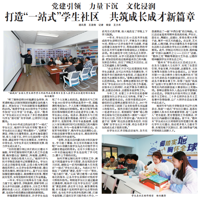 3月30日,中国石油大学报以《党建引领 力量下沉 文化浸润 打造“一站式”学生社区 共筑成长成才新篇章》为题,报道了地学院在社区育人综合体方面的探索与实践。