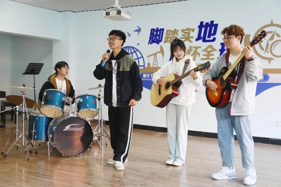 在学生社区多功能活动室内,各类乐器演奏出了一曲“中西合璧”的交响曲。社区活动室是使用频率最高的场地,声乐社、器乐社、舞蹈社、话剧社,常常在周末齐聚于此,展开一场艺术的盛会。在这里,艺术表演、心理团辅、学生团建等各类丰富校园生活的小活动都在学生社区的舞台上尽情展现。此外,学院还利用社区优势,组织编演“中国石油测井之父——王曰才”话剧、“勘探之光”舞蹈等原创文艺作品,让勘探精神融到学生日常生活之中。