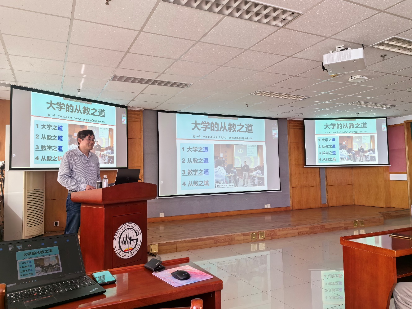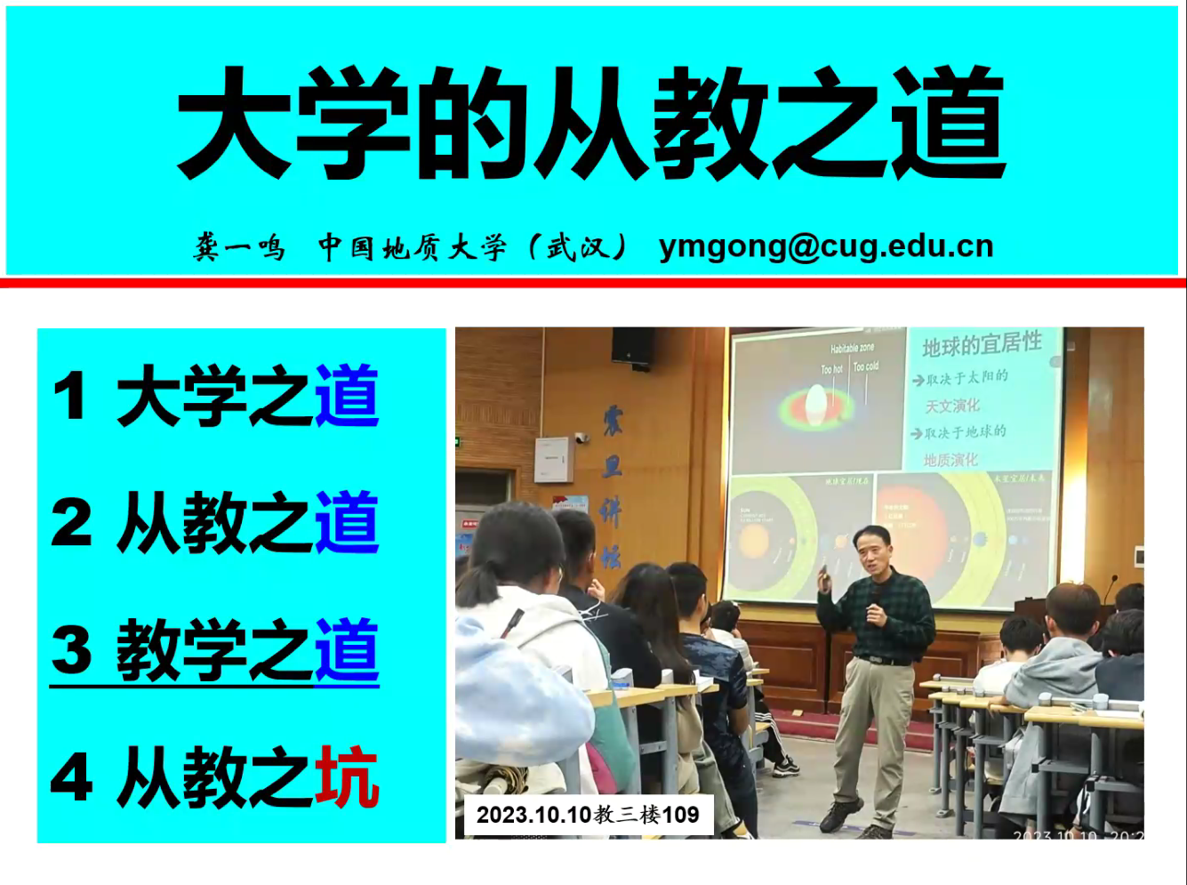 结合多年的教学科研经验,龚一鸣教授从大学之道、从教之道、教学之道和从教之坑等4个方面系统深入阐明了大学从教之道的内涵和本质。他首先介绍了大学之道的含义,他引用了孔门弟子曾子所作的《大学》的内容,即真善美、止于至,包含明明德和亲民两方面,包括格物、格知、诚意、正心、修身、齐家、治国和平天下等内容。随后,他从爱道、研道和学道三方面阐述从教之道的内涵:即爱道,热爱从教事业的原因包括职业之基、事业之本、家国之需、学生之盼;其次为研道,龚教授认为,教学与科研关系的理想呈现为莫比乌斯带,在上好课、育好人的同时与科研创新相辅相成;最后是学道,其内涵依次分为:为人之道,晓做人之理、学为事之道,明做事事之要、学为学之道,奠学养之基和学为师之道,铭育人之本。
