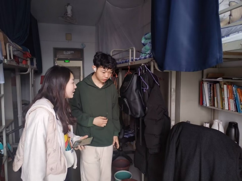 辅导员老师在宿舍进行卫生安全检查,与学生交流在校学习生活情况