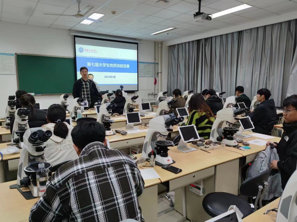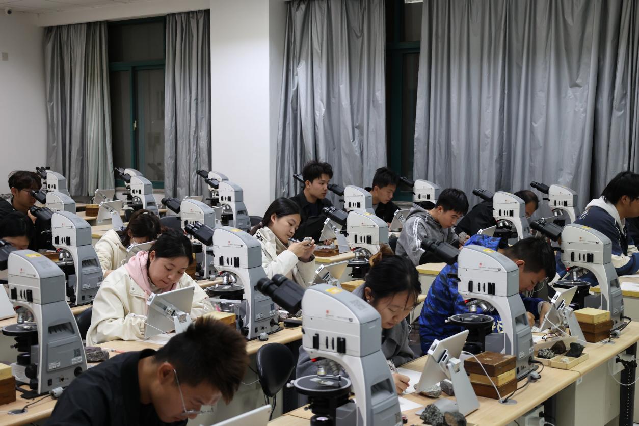 实验室中,参赛选手对各类岩石手标本及岩石薄片标本进行现场识别分析并提交鉴定报告。比赛过程中,选手们全神贯注,心无旁骛地观察岩石标本,有条不紊地操作显微仪器,结合自身所积累的地质知识完成报告。