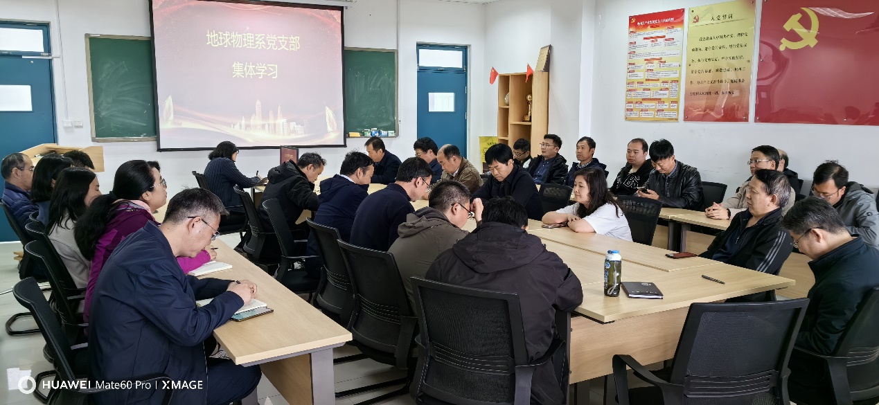 4月15日下午,地球物理系党支部组织全系教师集体学习学院近期出台的工作文件。学院党委书记牛庆玮、副院长王冠参加会议,地球物理系主任曹丹平教授主持会议。