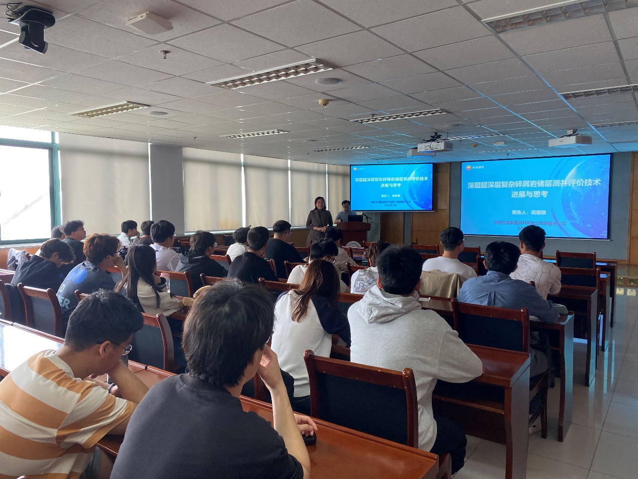报告会上,蔺敬旗总地质师介绍了目前全球及中国深层-超深层碎屑岩油气勘探现状,提出了深层-超深层储层特征与形成机制,构造变形与地质力学、岩石力学机制、油气资源的特点与评价方法等科学问题,并针对深层超深层复杂的工程问题,即高温高压测井装备的研发提出了自己的见解。最后以新疆准噶尔盆地南缘为例,总结了准噶尔盆地超深层储层测井评价难题,从4个方面说明了测井面临的挑战,鼓励师生潜心钻研、为深层超深层测井评价贡献力量。会后我院师生与蔺总展开了热烈讨论。