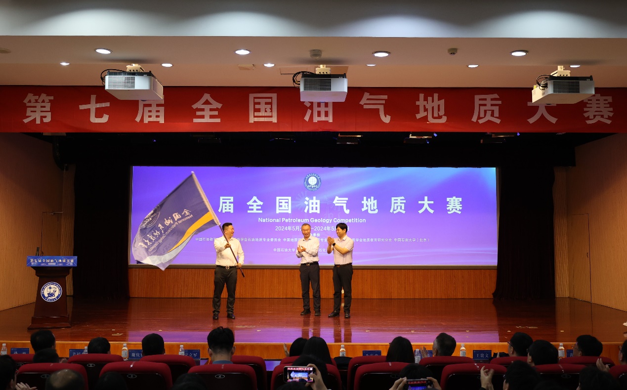 闭幕式上,太阳成集团tyc151cc、中国石油大学(北京)代表向第八届全国油气地质大赛承办单位长江大学代表交接赛旗。
