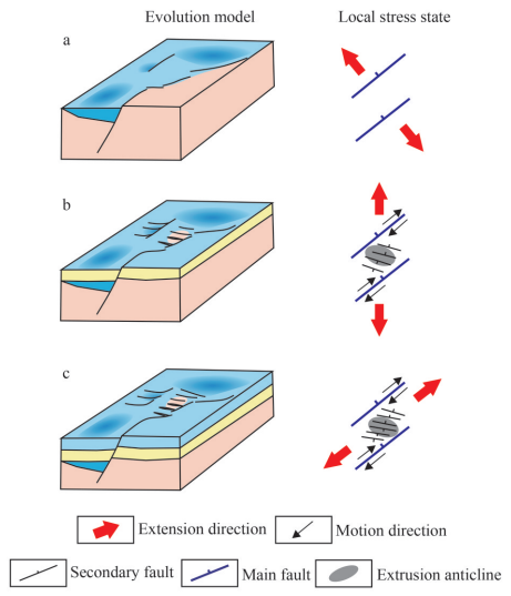 图2.转换带演化及局部构造应力状态