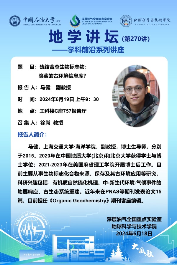 【地学讲坛第270讲】关于马健副教授《硫结合态生物标志物:隐藏的古环境信息库?》学术报告的通知