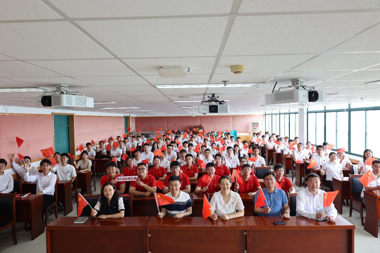 仪式现场奏响国际歌。随后,新党员进行入党宣誓,毕业生党员重温入党誓词,资源专业本科生党支部组织委员刘牧原领誓。