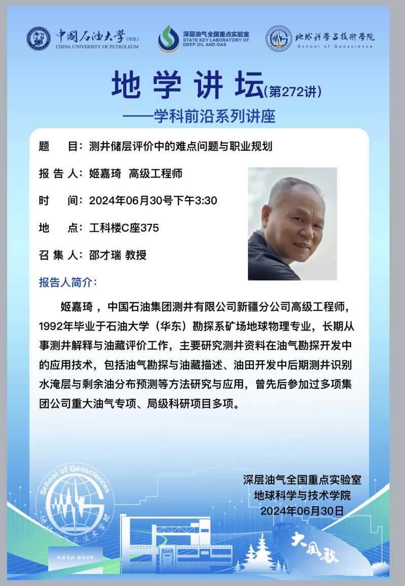 【地学讲坛第272讲】关于姬嘉琦 高级工程师《测井储层评价中的难点问题与职业规划》学术报告的通知