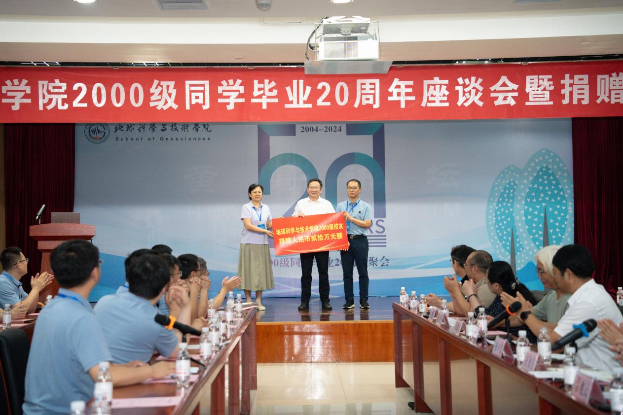 座谈会上,地学院2000级校友向学校捐赠了二十万元奖学金和一台实木地球仪。校友代表为昔日恩师献花,表达对老师在校期间谆谆教导的感激之情。