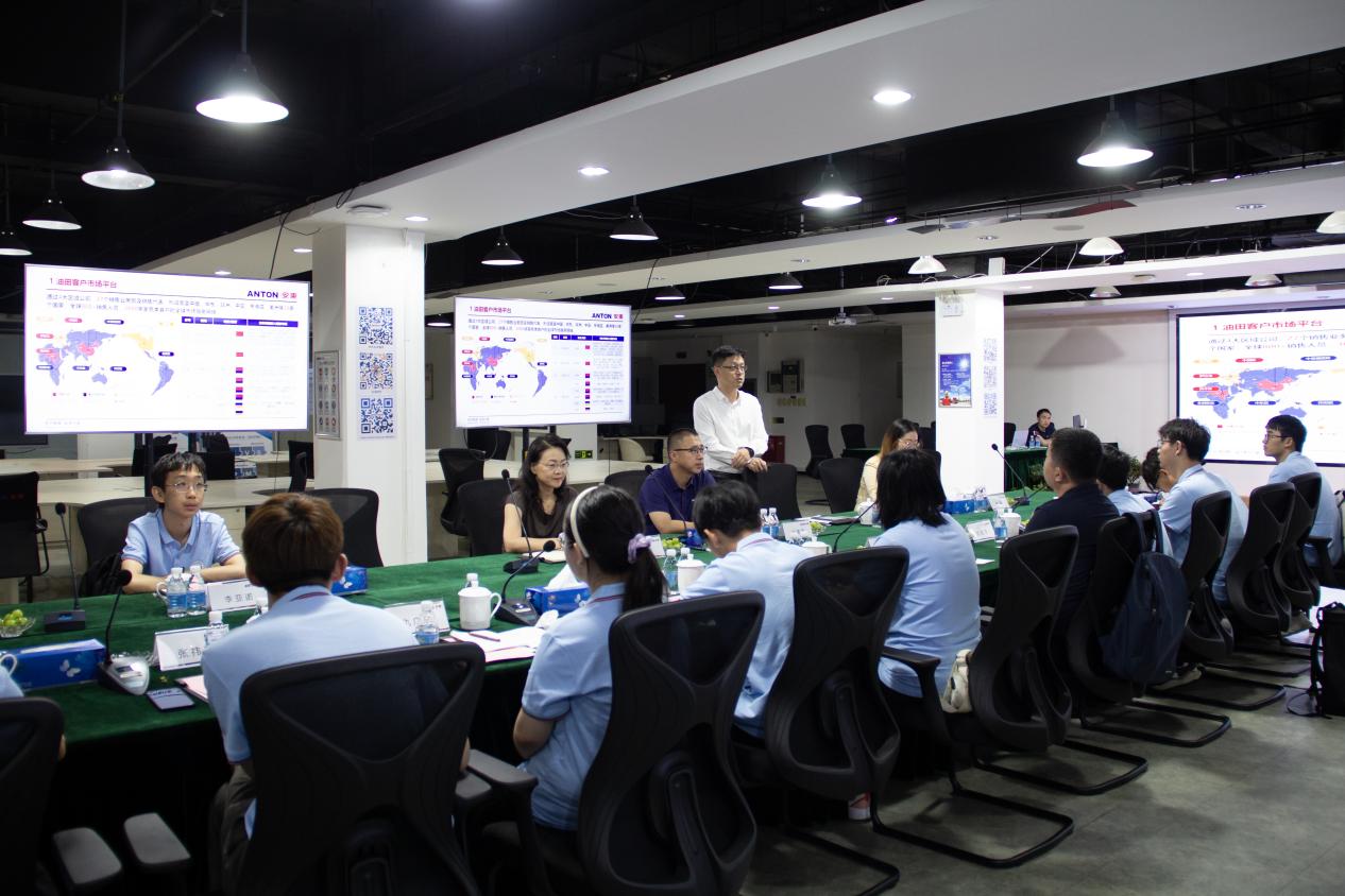 7月30日上午,实践团前往安东油田服务集团(北京)参观学习,深入探讨公司发展历程与企业文化,探讨行业发展趋势、技术创新以及职业规划等议题,获得取相关实践经验和行业见解。在集团技术管理部总经理刘艳的带领下,实践队成员参观了安东石油技术有限公司的工作环境,共同观看安东集团宣传片。集团人力资源部总经理张永华介绍了安东集团的发展历程、企业文化、全球化业务分布和人才培养管理理念等方面内容,向在座同学全方位剖析与介绍安东集团。