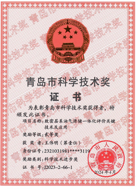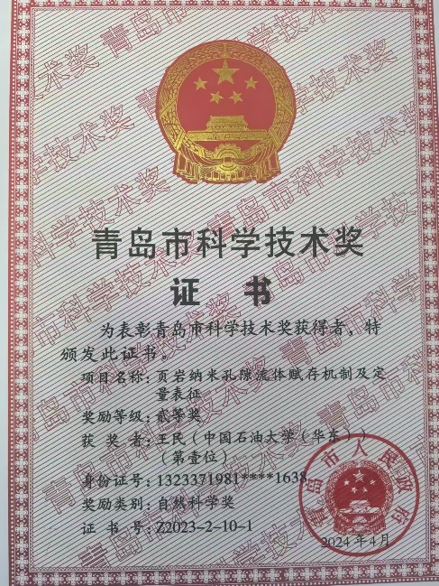 2024年8月16日,青岛市科技创新大会召开,对获得2023年度青岛市科学技术奖的项目和人员进行表彰。我院王民教授负责的《页岩纳米孔隙流体赋存机制及定量表征》项目获自然科学二等奖、王伟明副教授负责的《致密层系源储一体化评价关键技术及应用》项目获科技进步二等奖。