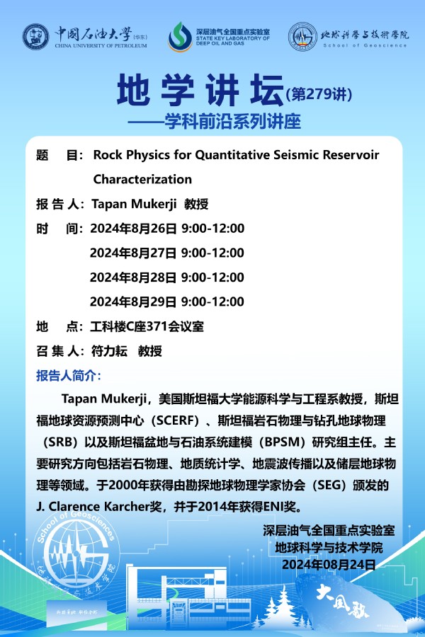 【地学讲坛第279讲】关于Tapan Mukerji教授《Rock Physics for Quantitative Seismic Reservoir Characterization》系列学术报告的通知