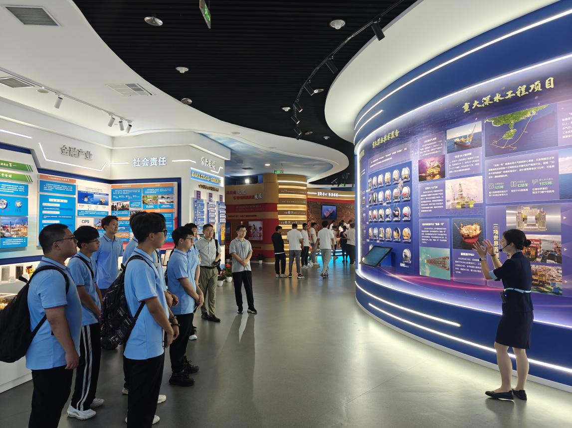 7月29日上午,北京实践团来到了中国海洋石油有限公司北京总部参观学习。在讲解员的带领下,实践团步入中国海洋石油工业展览馆参观学习,学习中海油在海洋石油工业领域的历史征程,从艰苦创业,到对外合作、跨越发展,再到奋进新征程,老一辈的石油革命家们为石油工业注入了源源不断的动力。在现场,实践团成员亲身感受油田数字化、现代化运行的震撼场面,深刻了解油田科技研发新机制和行业发展新突破。