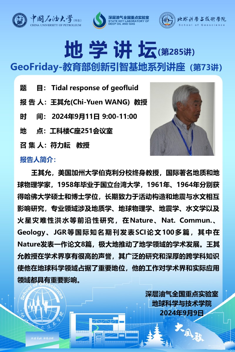 【地学讲坛第285讲】关于王其允(Chi-Yuen WANG) 教授《Tidal response of geofluid》学术报告的通知