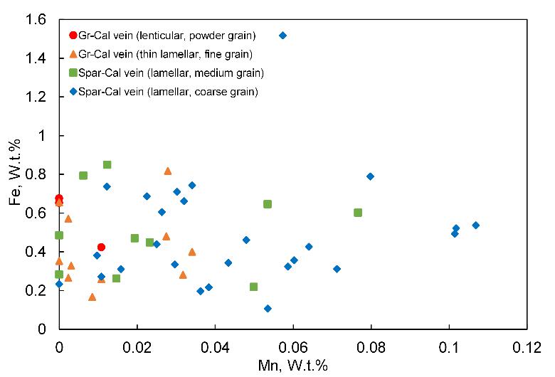 图2 不同方解石脉体的Fe、Mn含量变化特征