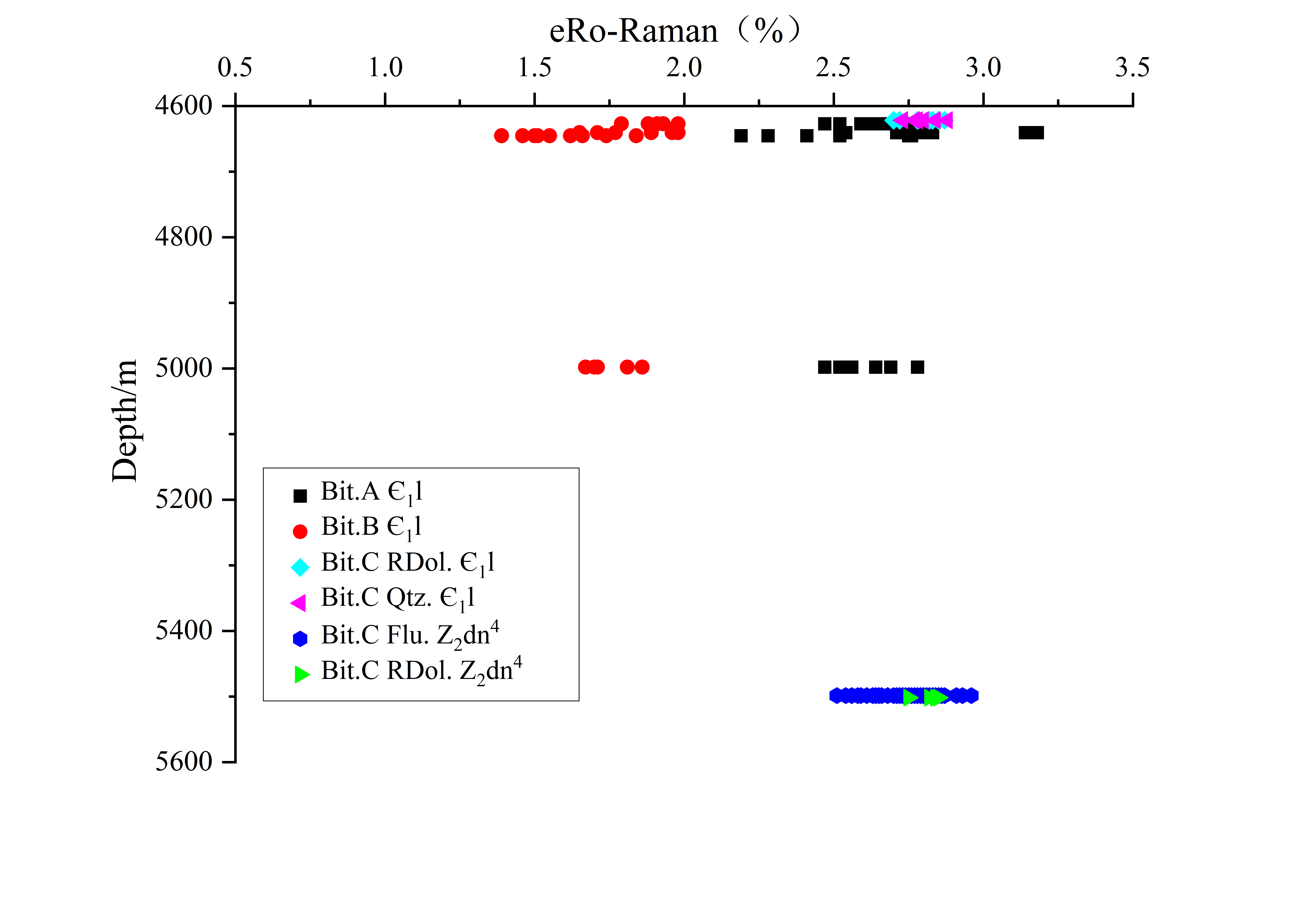四川盆地中部地区安岳气田储层固体沥青含量丰富,分布广泛。太阳成集团tyc151cc陈勇教授团队以川中磨溪地区寒武系龙王庙组(Є1l)和震旦系灯影组四段(Z2dn4)碳酸盐岩储层中孔隙和包裹体内的固体沥青为研究对象,系统开展了岩相学和固体沥青拉曼光谱、反射率及电子探针等分析工作,结果显示同源固体沥青在经历了相同的最高地温后,其成熟度存在显著差异(图1和2)。具体来说,根据岩石学观察,确定了三种类型的固体沥青(Bit. A、Bit. B和Bit. C)。Bit. A充填与早期细粒白云岩溶蚀孔隙,细小分散,eRo-Raman(通过拉曼光谱获得的等效镜质体反射率)值集中于2.60%~2.80%;Bit. B具较大的块状形态,分布在重结晶白云石或晚期自形之间的孔隙中或充填在缝合线中,eRo-Rama值在1.80%至1.90%之间;Bit. C为被各种成岩矿物捕获的沥青包裹体,eRo-Raman值在2.70%至2.87%之间(图2)。结合元素分析表明,硫元素的参与沥青热演化可能导致其成熟度的差异。该研究结果表明,在利用储层孔隙中(开放体系)固体沥青成熟度确定热演化史时应谨慎,而被捕获在包裹体(封闭系统)中的固体沥青作为成熟度指标更为可靠。